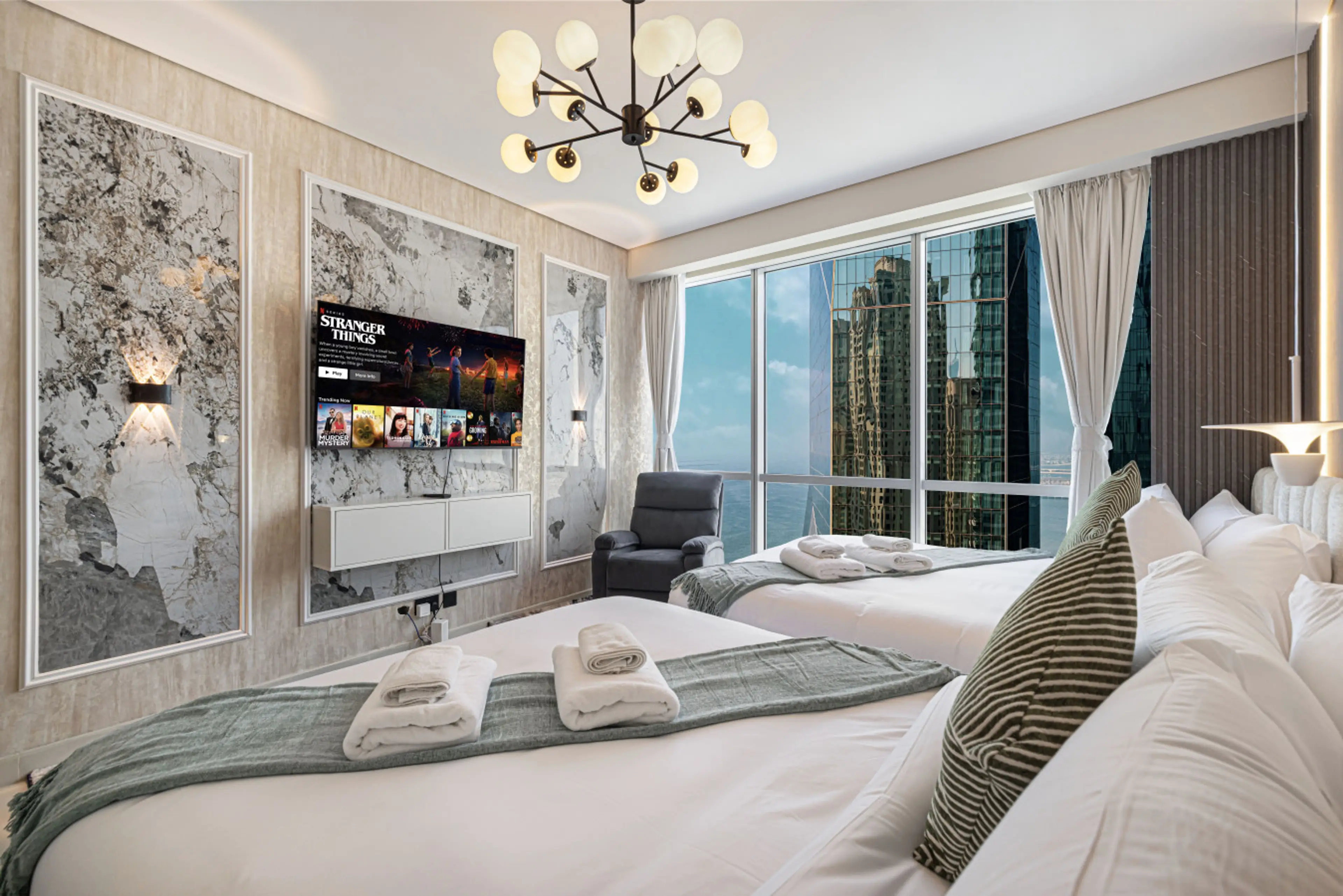 Experience a modern stay with Bergstays at Al Fattan Marine Towers in JBR, a luxury high-rise with stunning views, stylish layouts, and premium amenities including a gym, pool, and sun lounge. 🛏️ Sleeping Arrangements – 3 Bedrooms ♛ Master bedroom : King size bed with attached bathroom ♛ Bedroom...